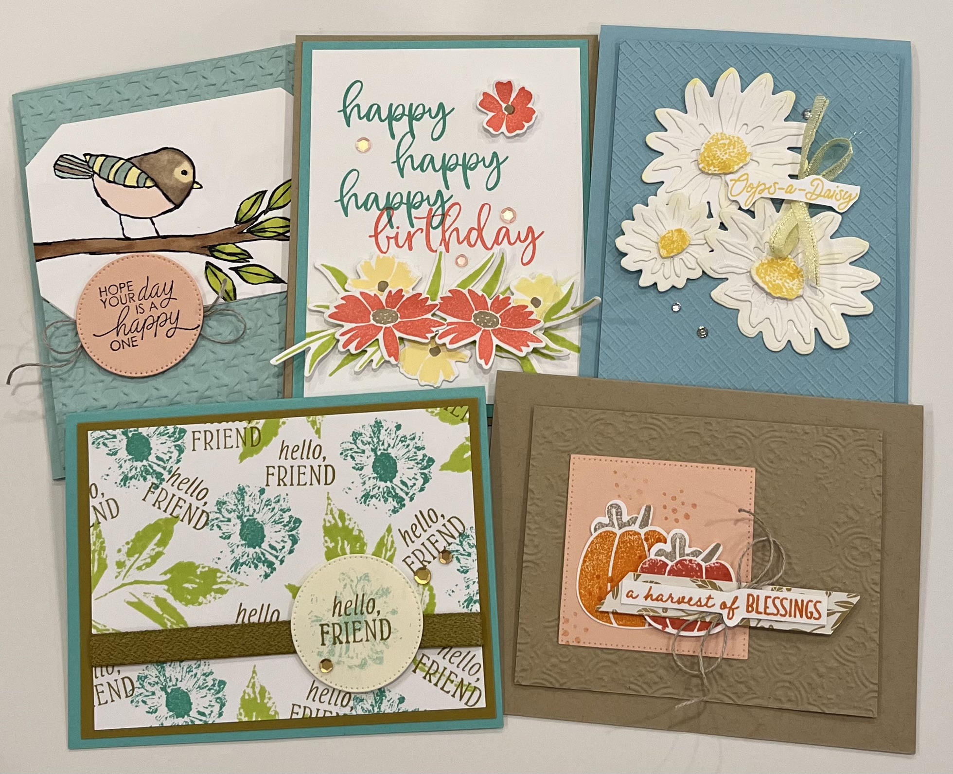 Come and make 10 All Occasion cards - 2 each of 5 designs. I will have lots of sentiments for you to choose. You will leave with a stack of 10 cards to have on hand to send when you need one.