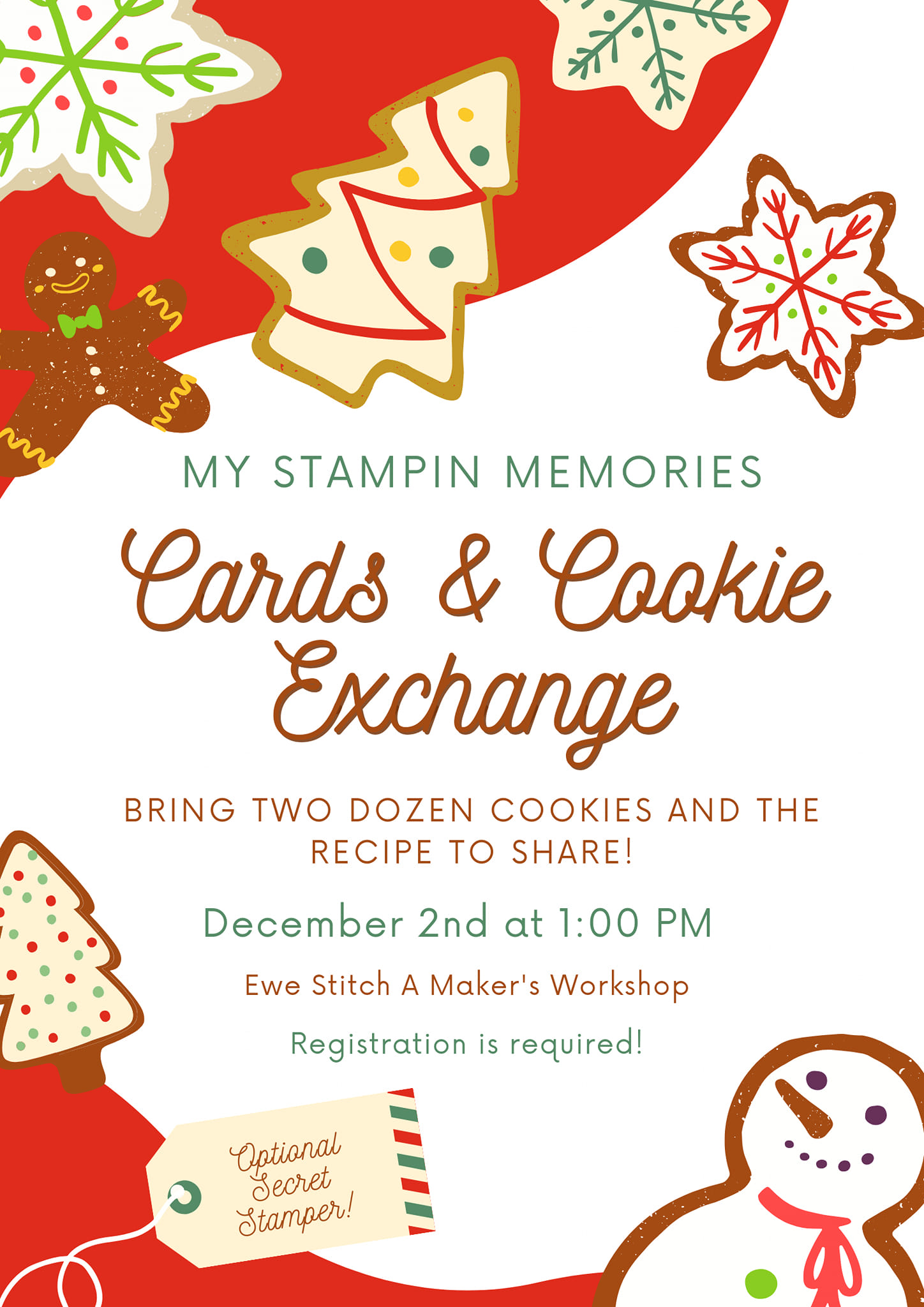 Cookie Exchange (Optional) - Please bring two dozen cookies along with a copy of the recipe to share with everyone. You may want to bring a large container to store the cookies in. This is completely voluntary and not required to attend the event.