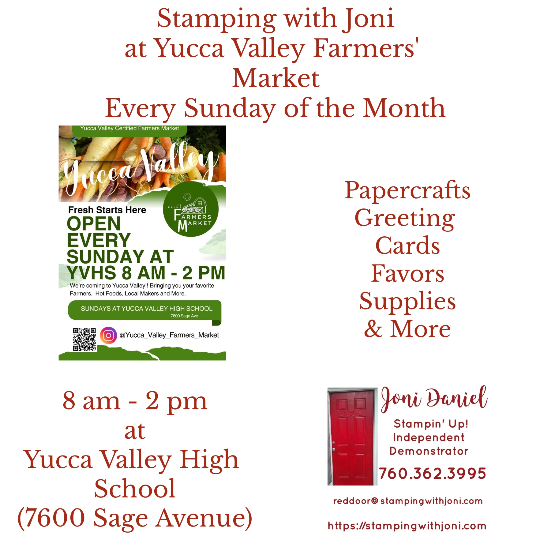 Join me at the Yucca Valley Farmers' Market every Sunday of the month unless otherwise noted! I will have all occasion cards, seasonal cards, favors, adhesives, and so much more! The Market runs from 8 am - 2 pm at Yucca Valley High School (7600 Sage Avenue). Come see everything in person! I would love to meet you!