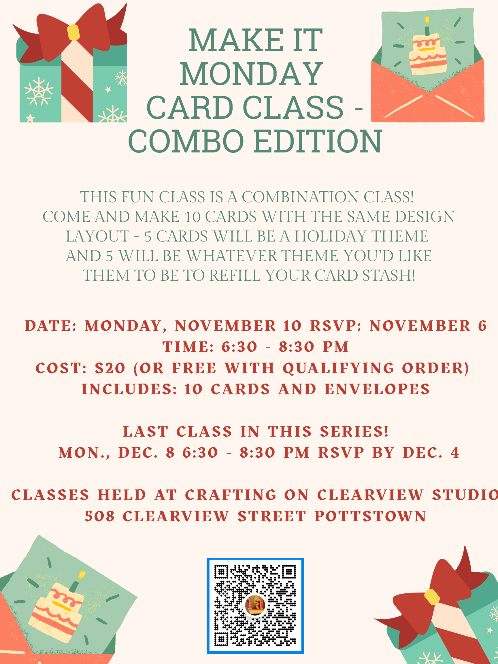 What are we making tonight!? This fun class is a combination class! Come and make 10 cards with the same design layout - 5 cards will be a holiday theme and 5 will be whatever theme you'd like them to be to refill your card stash!