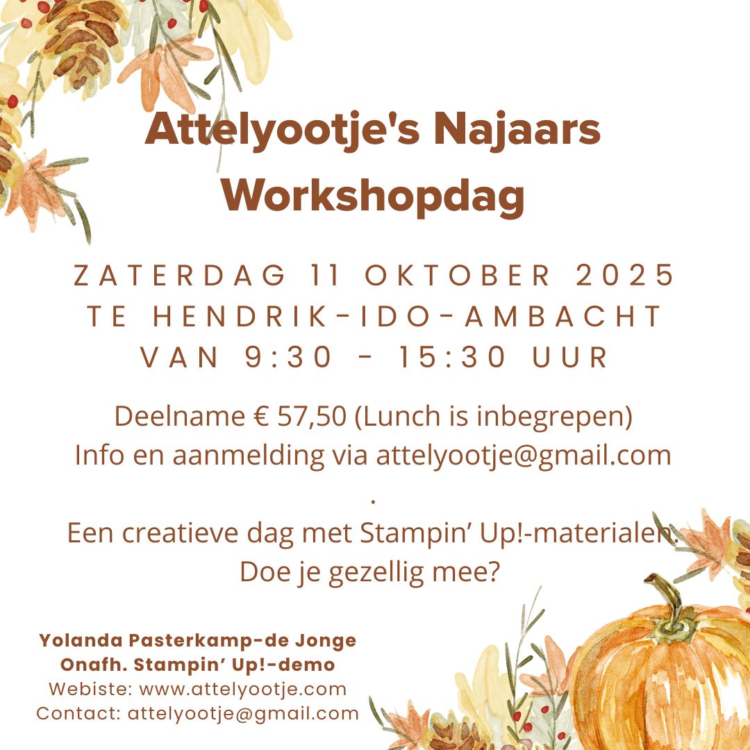 Een gezellige maar leerzame creatieve dag. Verwennerij voor jezelf. Inclusief lunch, materialen en gebruik van mijn producten van Stampin' Up! Graag wel eigen gereedschap meebrengen.