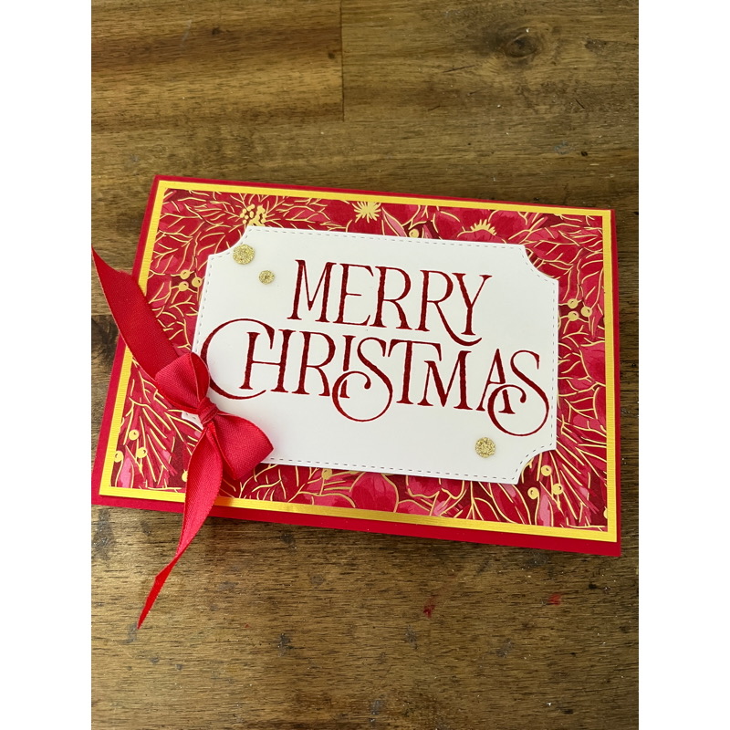 Honestly this is a fantastic stamp set. Which you will keep forever. The script is perfect and easy to heat emboss as well. I used Real Red Classic ink and Clear embossing Powder to give the script that extra shine.