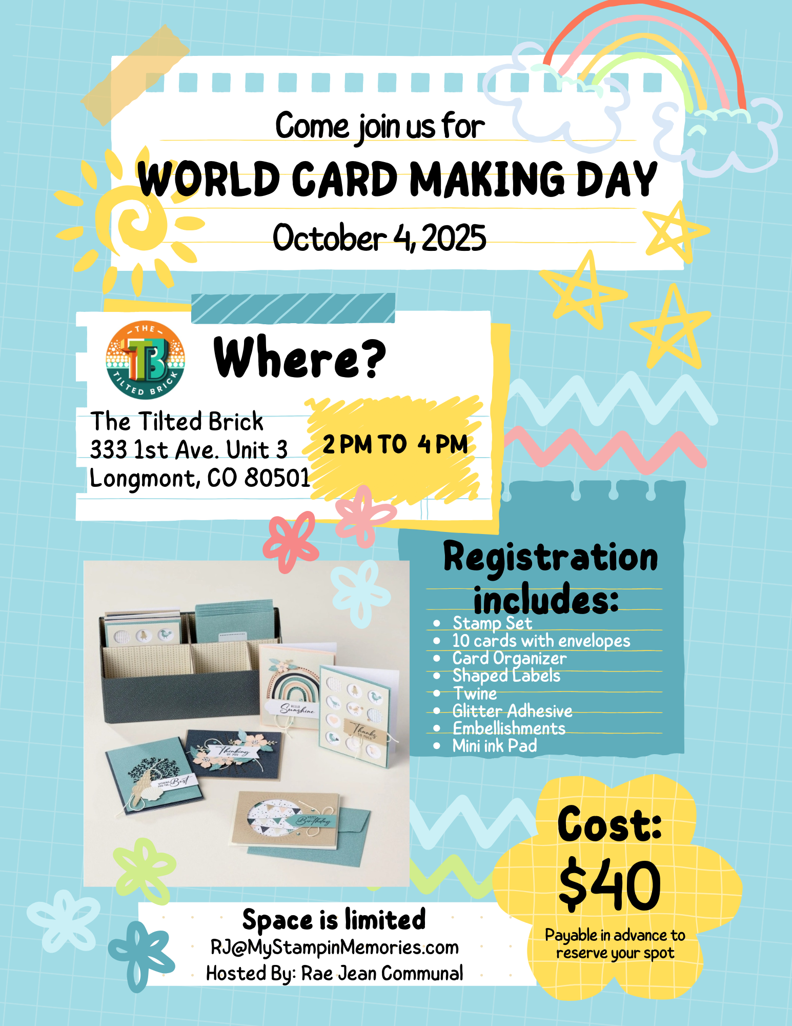 Are you ready? I'm thrilled to announce that I'm collaborating with The Tilted Brink in Longmont to host an entertaining event in celebration of World Card Making Day on October 4th. Invite your friends and join us. Space is limited!