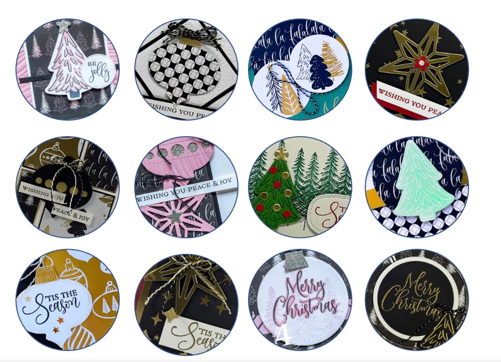 Other: Ornamental Christmas Dies (166000), Traditional Labels Dies (165864), Stylish Shapes Dies (159183), So Swirly EF (163791), Damask Designs Embossing Folder (EF) (165214), Soft Waves 3D EF (164695), 2” Circle Punch (133782), Black & White & Gold Baker’s Twine (166005), Large Gold Hoops (166004), Iridescent Faceted Gems (163368), Gold Shaker Stars (166065), Metallics Wow! Embossing Powder (165678), Basics Wow! Embossing Powder (165679), Heat Tool (129053), Wink of Stella (141897), Small Blending Brushes (160518)