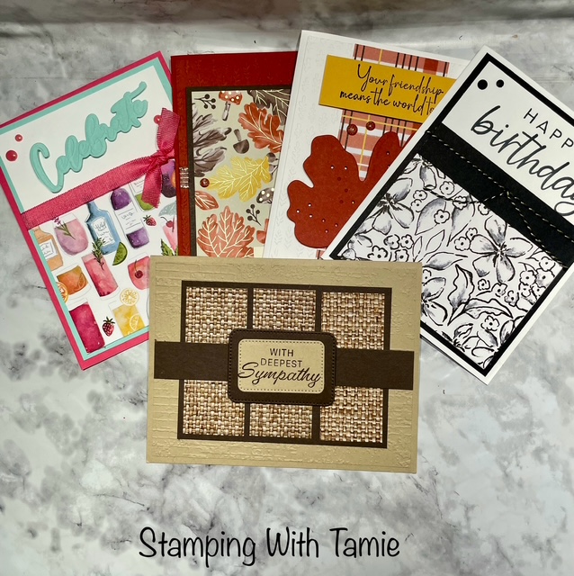 Come and make 10 cards, 2 each of 5 differnet cards with envelopes for FREE with a $28.00 order or pay a flat fee of $23.00.