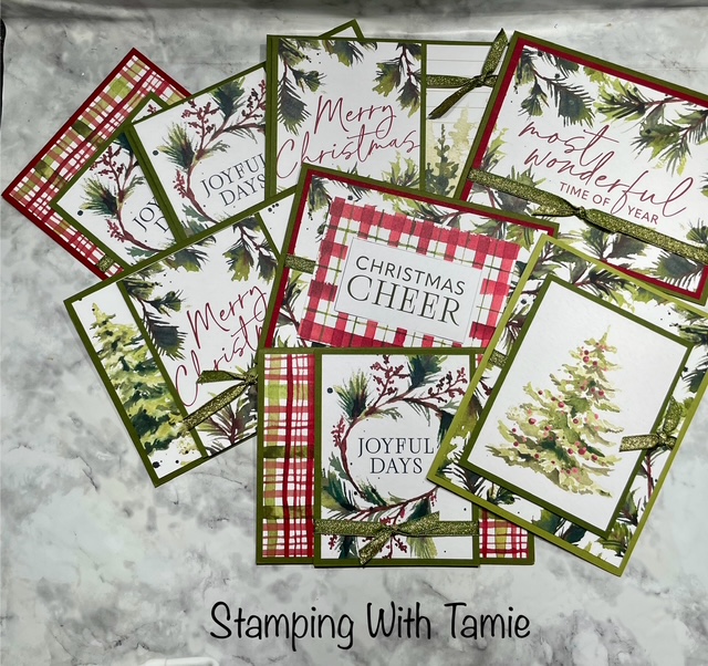 Card Club Class comes with product, A package of the Memories & More card pack and a bolt of green & gold ribbon. Then you will make 14 cards with envelopes using your supplies.