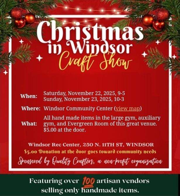 Who is thinking Holidays? Time to mark your calendars to come shop an AMAZING selection of handmade crafts during the 46th Annual Christmas in Windsor Craft Show! Over 100+ vendors will be at this show! This is a two day event.