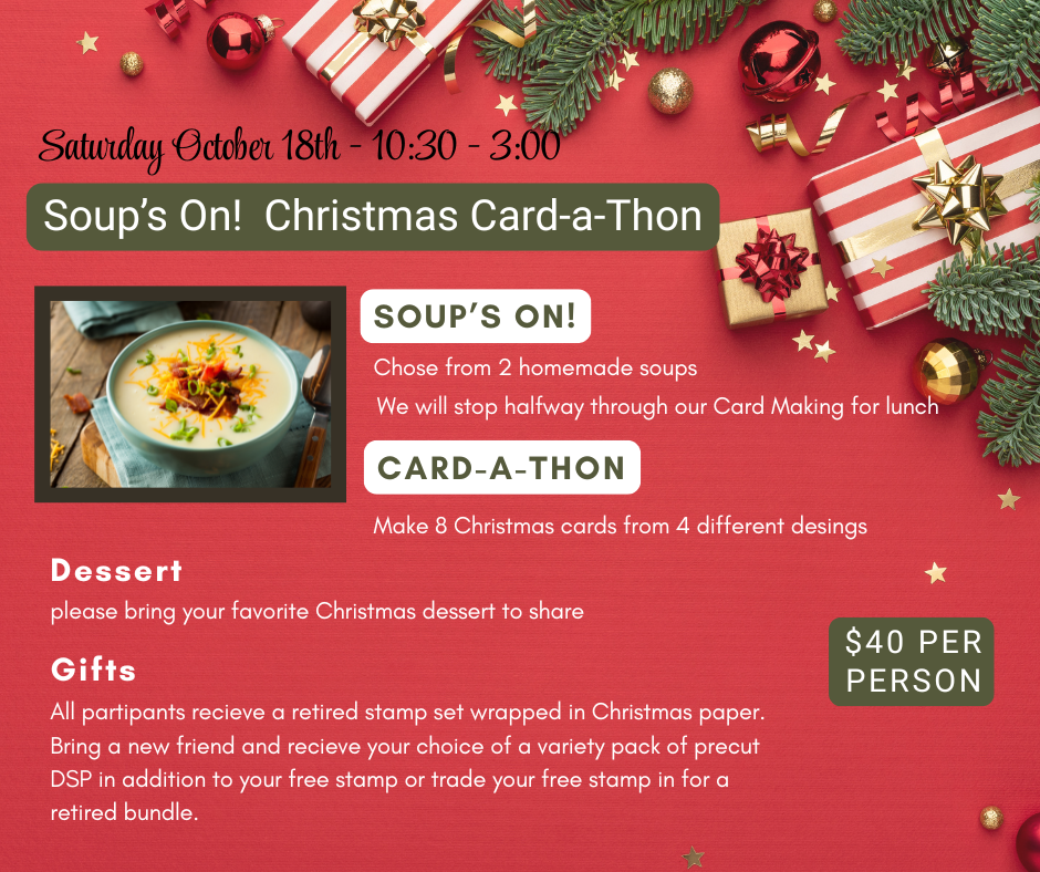 Join us for our annual Christmas Card event. Each year we create Christmas cards and break for a lunch - homemade soup. The kitchen and craftroom will be decorated for Christmas to get us in the mood to create our holiday cards. We will be making eight cards in four different designs. Seating is limited so sign up soon.