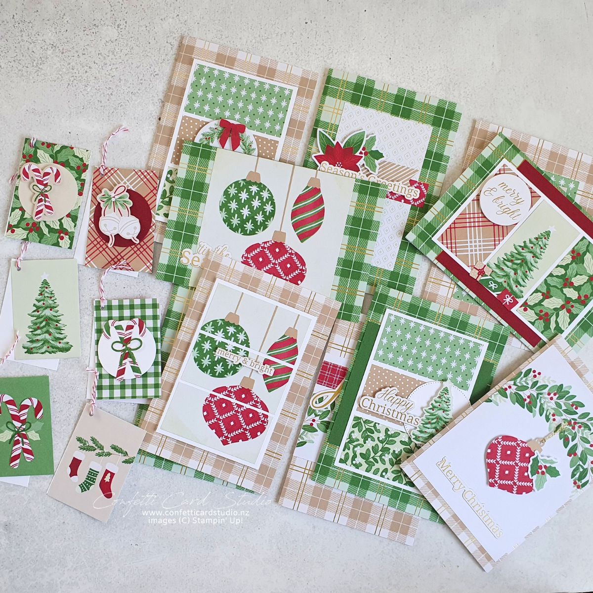 We will make 10 Christmas Cards and 6 Christmas Tags together. You will have left over sentiments and designer series paper to make more.