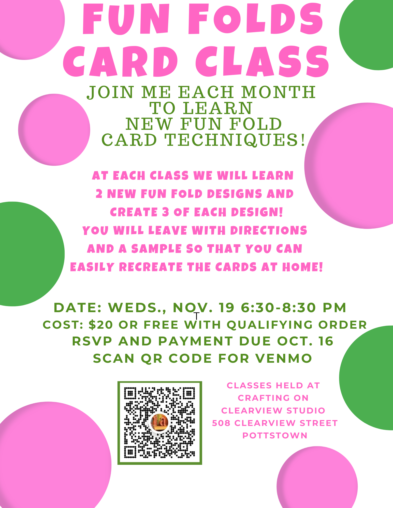 At each class we will learn 2 new fun fold designs and create 3 of each design! You will leave with directions and a sample so that you can easily recreate the cards at home!