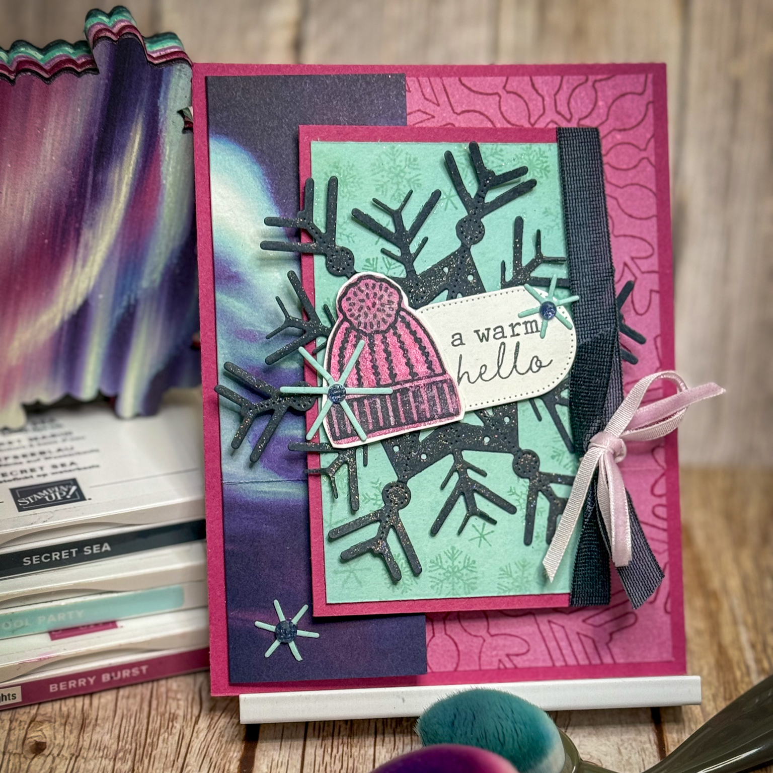 Get ready to cozy up and craft with a fresh take on winter. This class features the Snowy Delights Bundle and the Stay Warm Stamp Set, paired with the stunning Lights of Aurora Designer Paper for a soft, shimmery snowflake look that’s anything but ordinary.