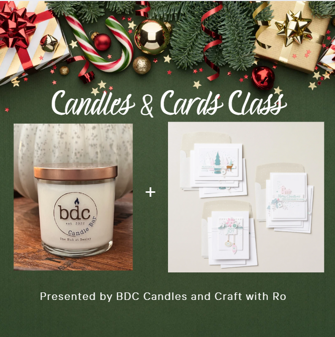 Join us for the Candles and Card Workshop, a delightful crafting experience where you can unleash your creativity just in time for the holiday season! On Saturday, December 6th, from 4–6 PM, immerse yourself in the art of candle-making and card crafting. You'll have the opportunity to create your very own personalized candle and design nine unique holiday cards that are perfect for spreading festive cheer. To enhance the experience, wine and beer will be available for purchase, adding a touch of relaxation to your afternoon. The class is priced at $55 per person, and with limited seating available, be sure to register soon to secure your spot. Don’t miss out on this fun and inspiring workshop! Register Here