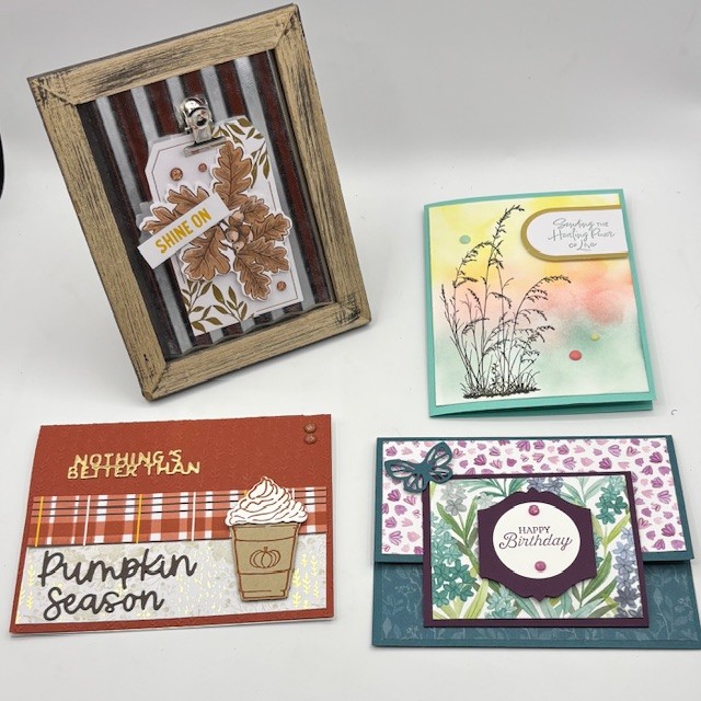 The bottom right hand card is a fun fold card. Class is for both beginning & experienced stampers.