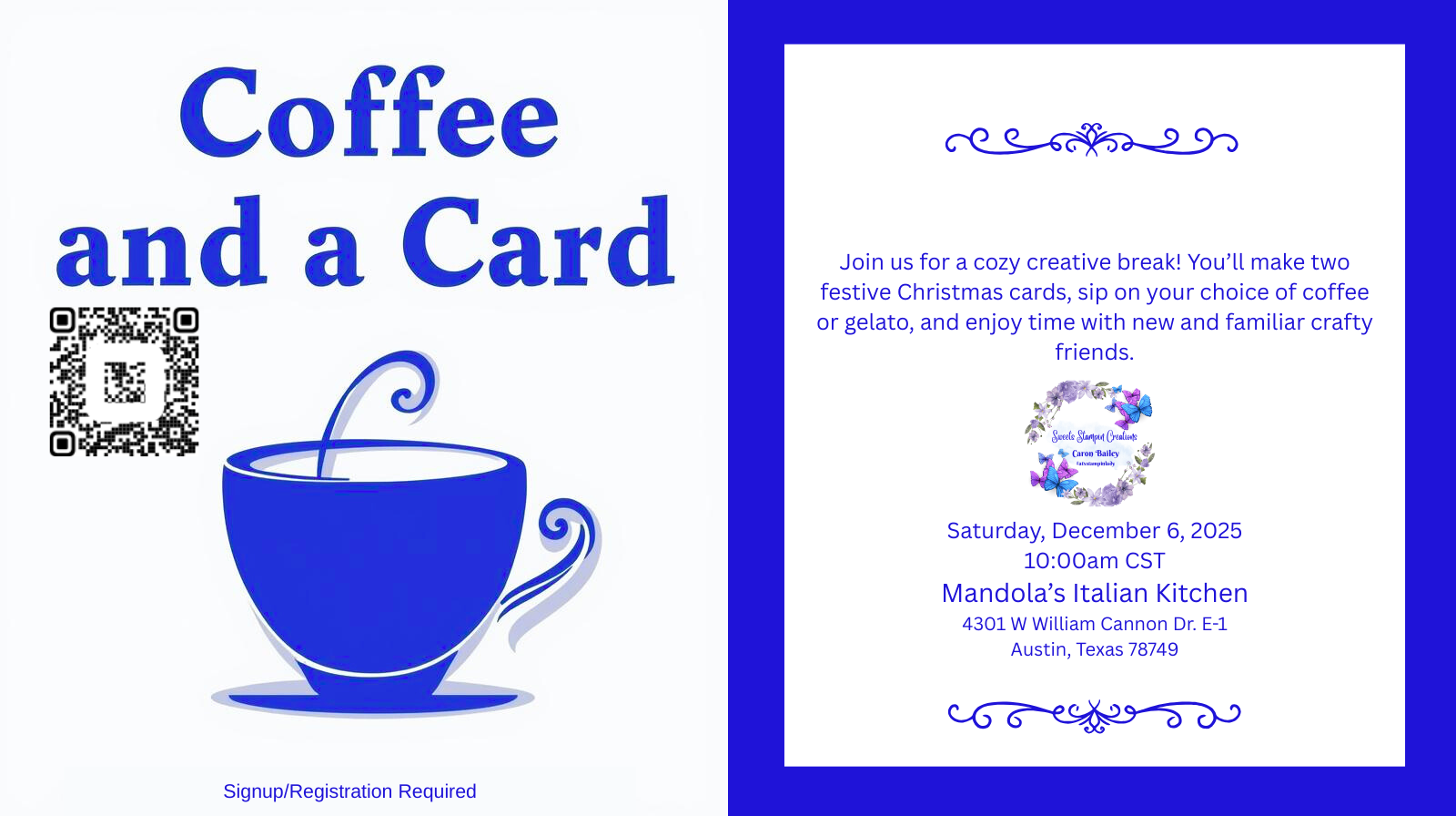 Join us for a cozy creative break! You’ll make two festive Christmas cards, sip on your choice of coffee or gelato, and enjoy time with new and familiar crafty friends.