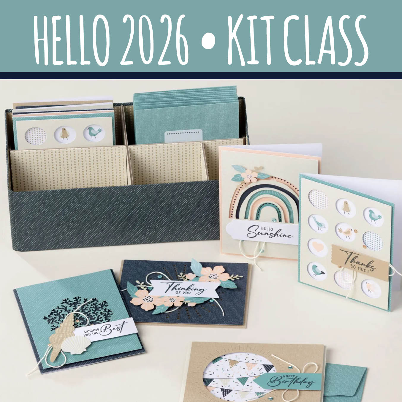 Kick-off the New Year right and join us to make 10 cards - complete with envelopes, stamp set, ink pad, clear stamp block, adhesive, and even a card organizer to get you ready to celebrate all things 2026.