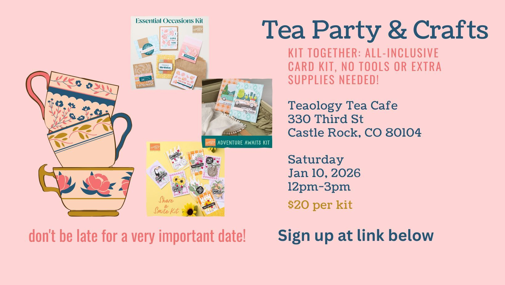 I'm so excited to be hosting a Kit Together at the cutest little tea cafe in Castle Rock, and YOU are invited! Mark your calendars and click on the sign up link below. What is a Kit Together, you ask? We will get together, sip tea, and assemble one of three simple card kits. All supplies are included - $20 per kit. You just need to sign up and show up, your kit will be ready for you when you arrive.