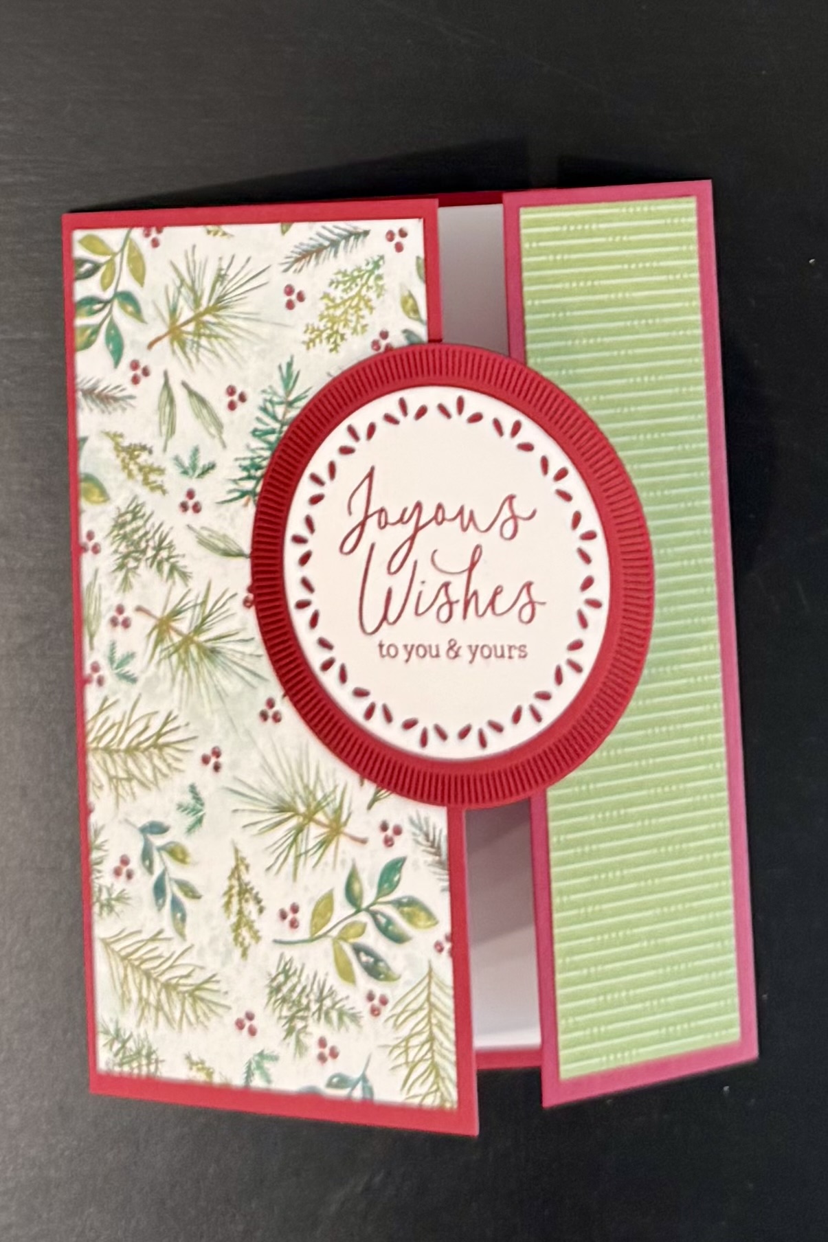 My Holiday cards are in the mail! I am a few cards short and want you to join me as I put them together! This offset fold card highlights our beautiful Elegant Pines DSP.