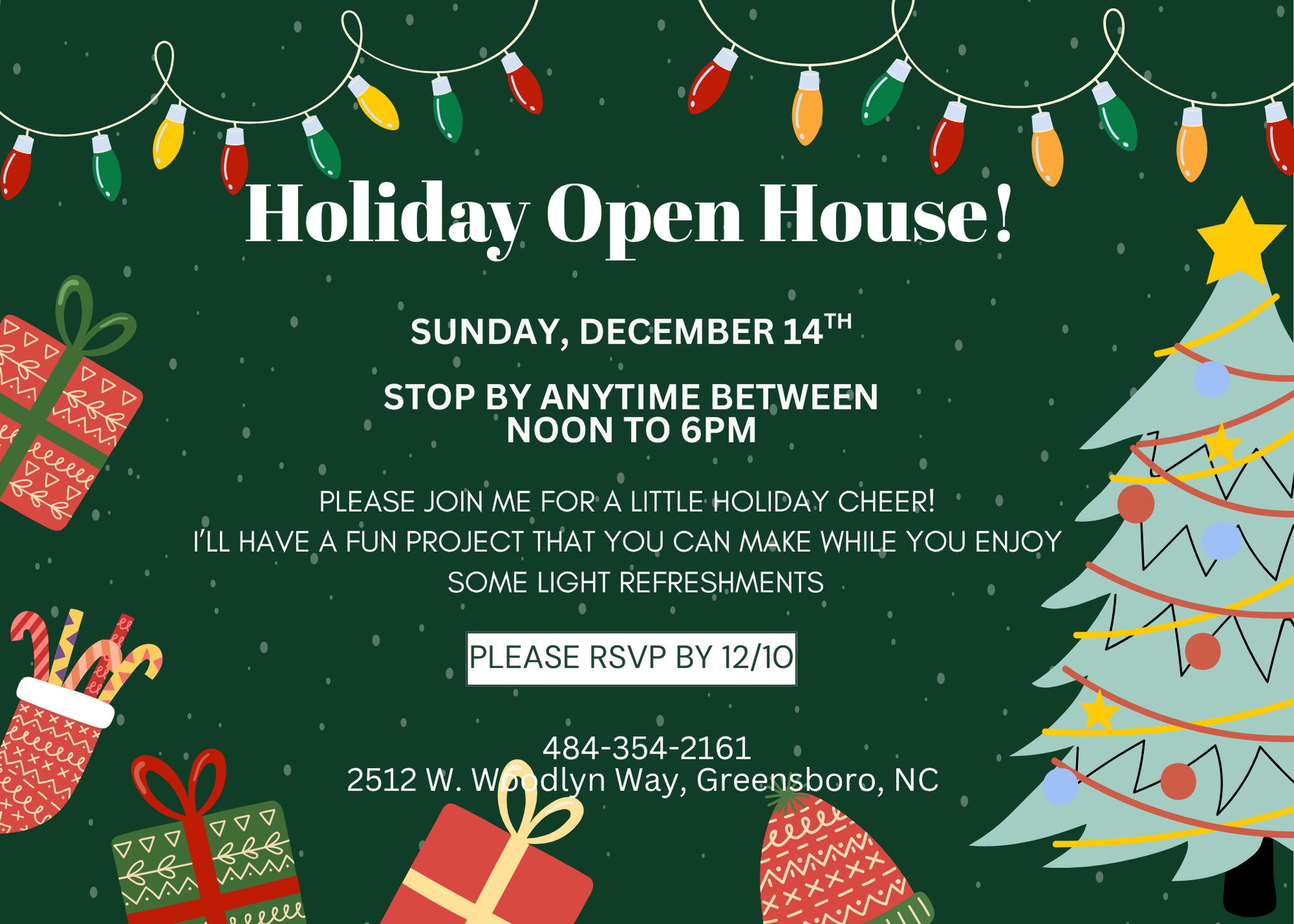 If the holiday hustle has you feeling like a tangled string of lights, come unwind with me! Drop in anytime between noon and 6 PM on Sunday, December 14th for a little merry-making. I’ll have a quick, fun project you can whip up, plus some tasty treats to snack on while you relax.