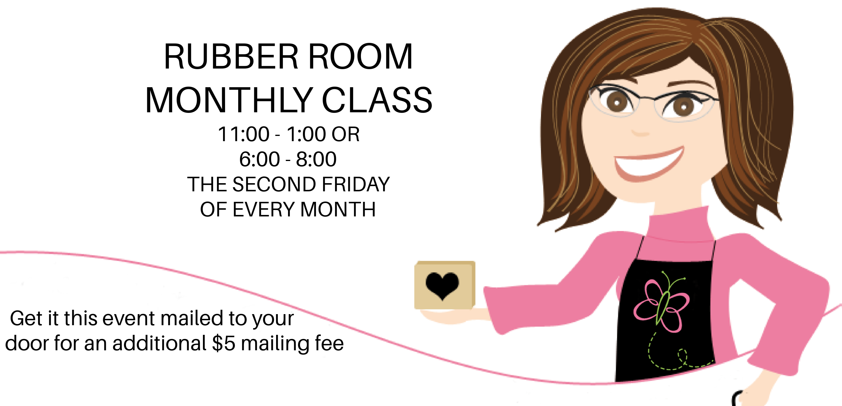 This is the monthly Rubber Room Class. This class will feature one stamp set, suite or bundle. You will make four cards for $15. If you would like to "boost" your class and make 8 cards (2 each of all 4 designs), you can stamp and assemble your first cards during class, and stamp and prep your second cards, assembling them at home at your leisure. Cost for a "boosted class" is $23. You can order the RR Monthly Class To Go for an additional $5 for mailing.