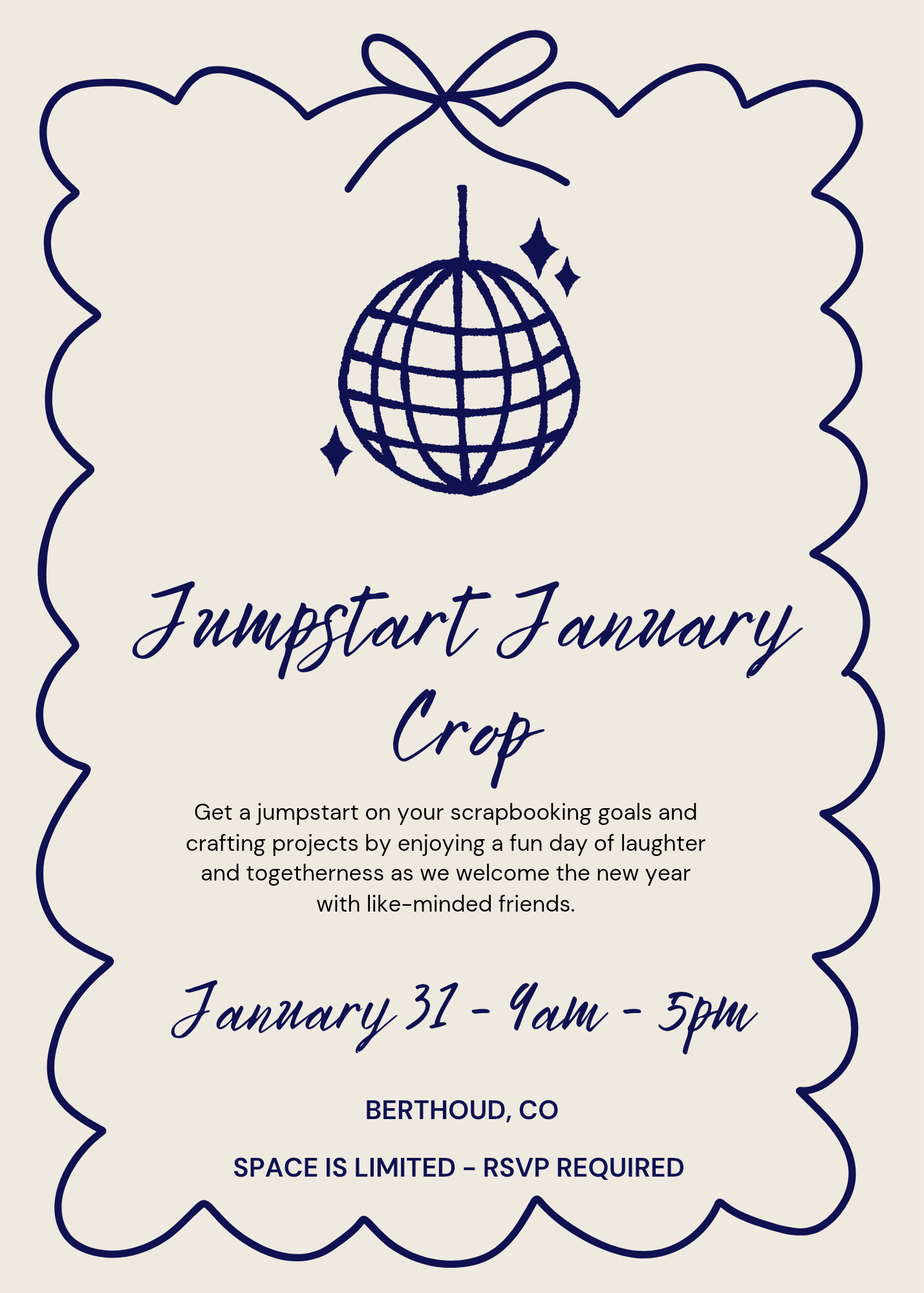 Get a jumpstart on your scrapbooking goals and crafting projects by enjoying a fun day of laughter and togetherness as we welcome the new year with like-minded friends. Space is limited. You must complete this form and submit payment to have a spot held for you.