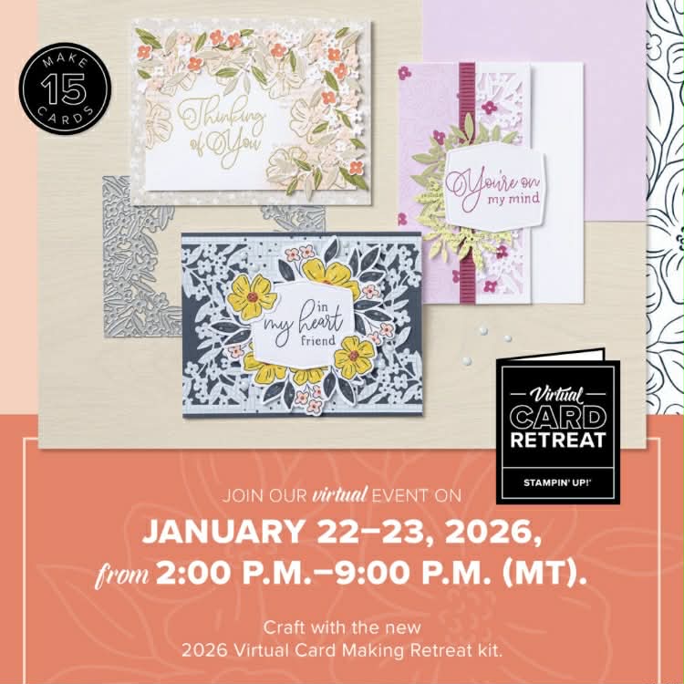 Purchase the Virtual Card Retreat (item #170023) then join me to watch along with the Live video presentation as we craft along together to create 15 cards!