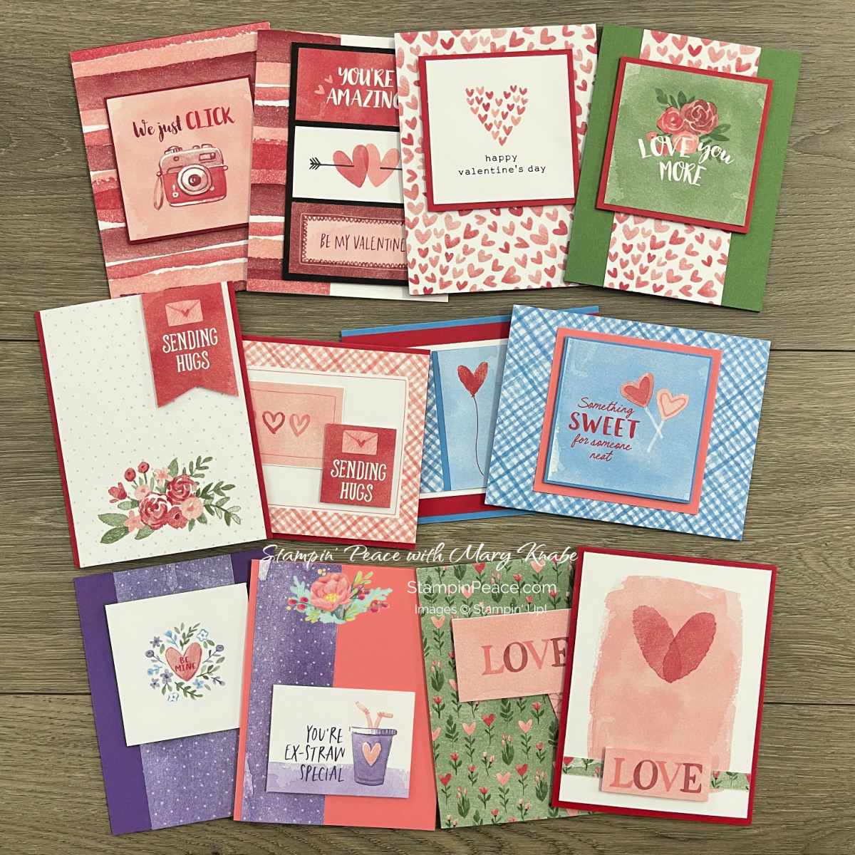 Happy New Year, Stampin’ Peace Friends! Let’s kick off the year together with my Love Notes Card Class to Go. You’ll make 12 different cards featuring the Love Notes 6″ x 6″ Designer Series Paper. The cards are quick, easy, and fun to make. AND there’s no stamping. That’s right! Each of the sentiments you see on the cards in the photo below are printed onto the Love Notes DSP. Pretty cool, huh? And as you can see, these cards are great for Valentine’s Day and for sending love throughout the year.