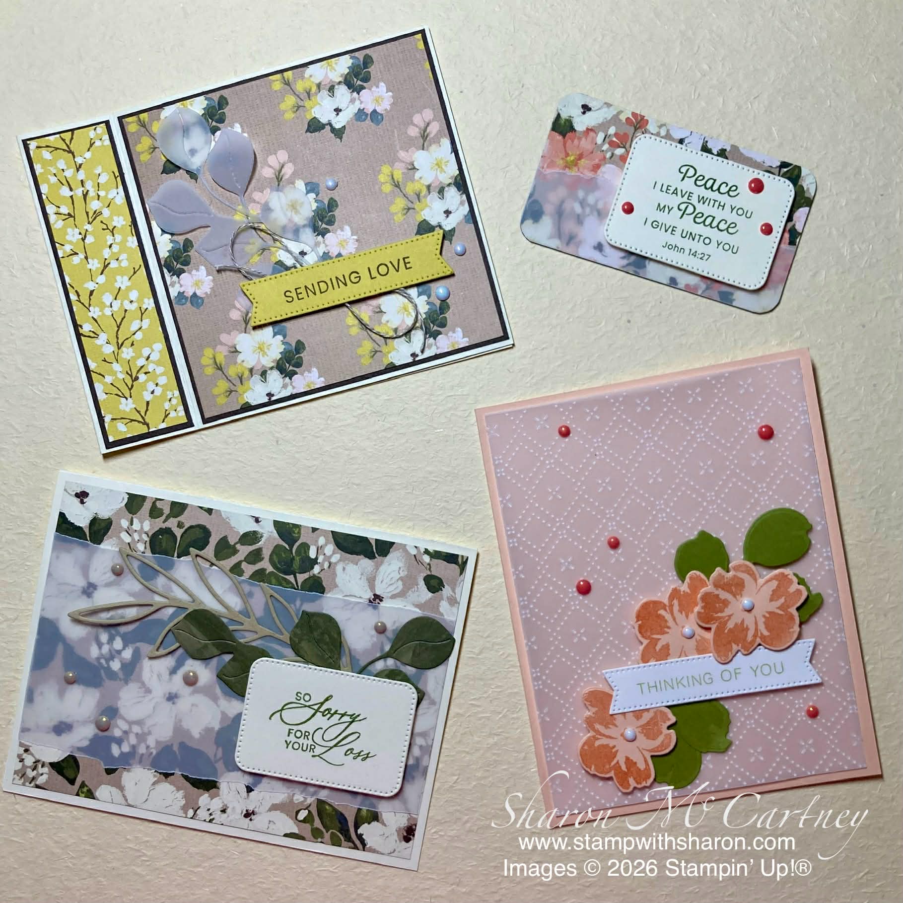 Come make the cards that you don't want to have to send, but are so meaningful to the recipient. The new Prayers & Promises stamp set is the featured product for this class during which you'll make three cards and one magnet. One thing I love about this stamp set is that it has sentiments for the inside of the cards. I know it's sometimes hard to know just what to say, and this set does it for you. Visit the discussion tab at the event on Facebook for individual photos, including the inside sentiments.