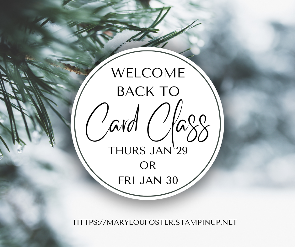 Monthly Card Classes are back! Join me either Thursday, Jan. 29 or Friday, Jan. 30 at 1:30 for your monthly creative escape. There will be 4 brand new, never before seen cards for you to to make. This class can be FREE with a minimum $25 order placed either before or at the class. If you choose to pay, cost is $20. It's going to be so nice to see you.