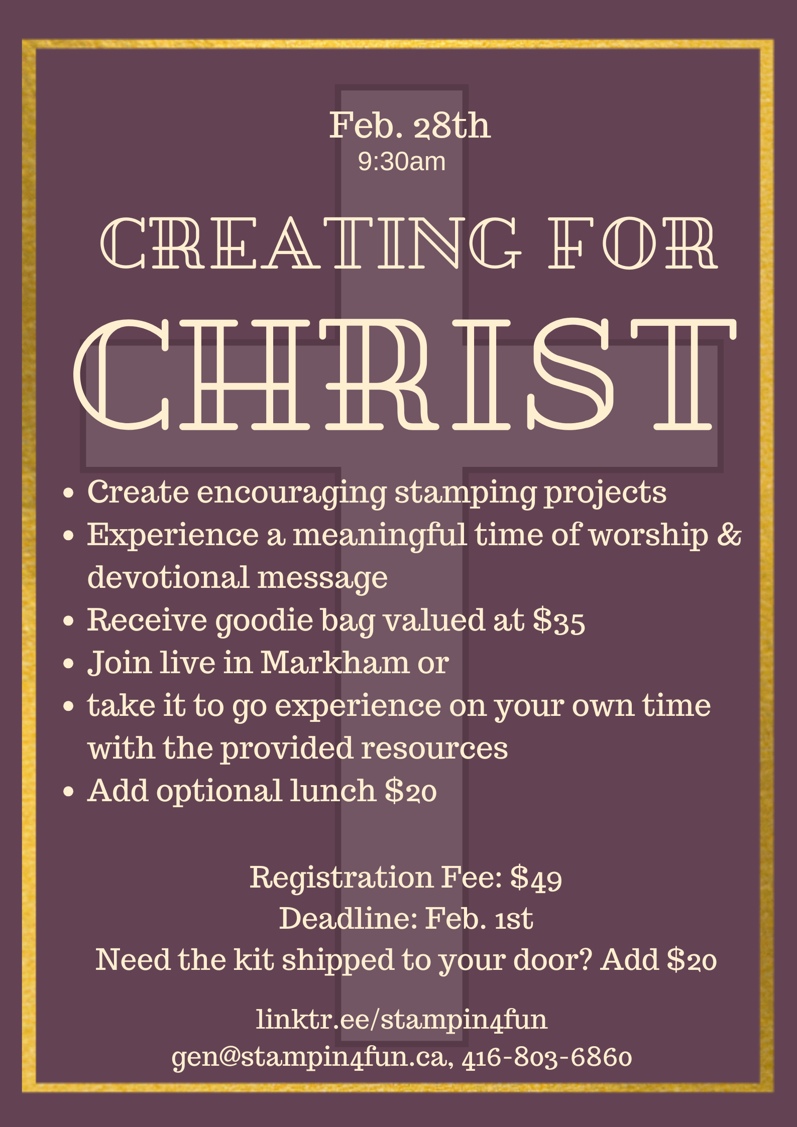 Feb 28th 10am Creating for Christ Make space to join in for this meaningful creative experience with Christ-centered projects, reflections and music. It’s not too early to begin preparing our hearts for Easter! Project supplies and Small crafty goodie bag included. Cost: $49. Can’t attend in person? Choose the Take it to go option. (Add $20 for direct shipping) RSVP by Feb. 1st.