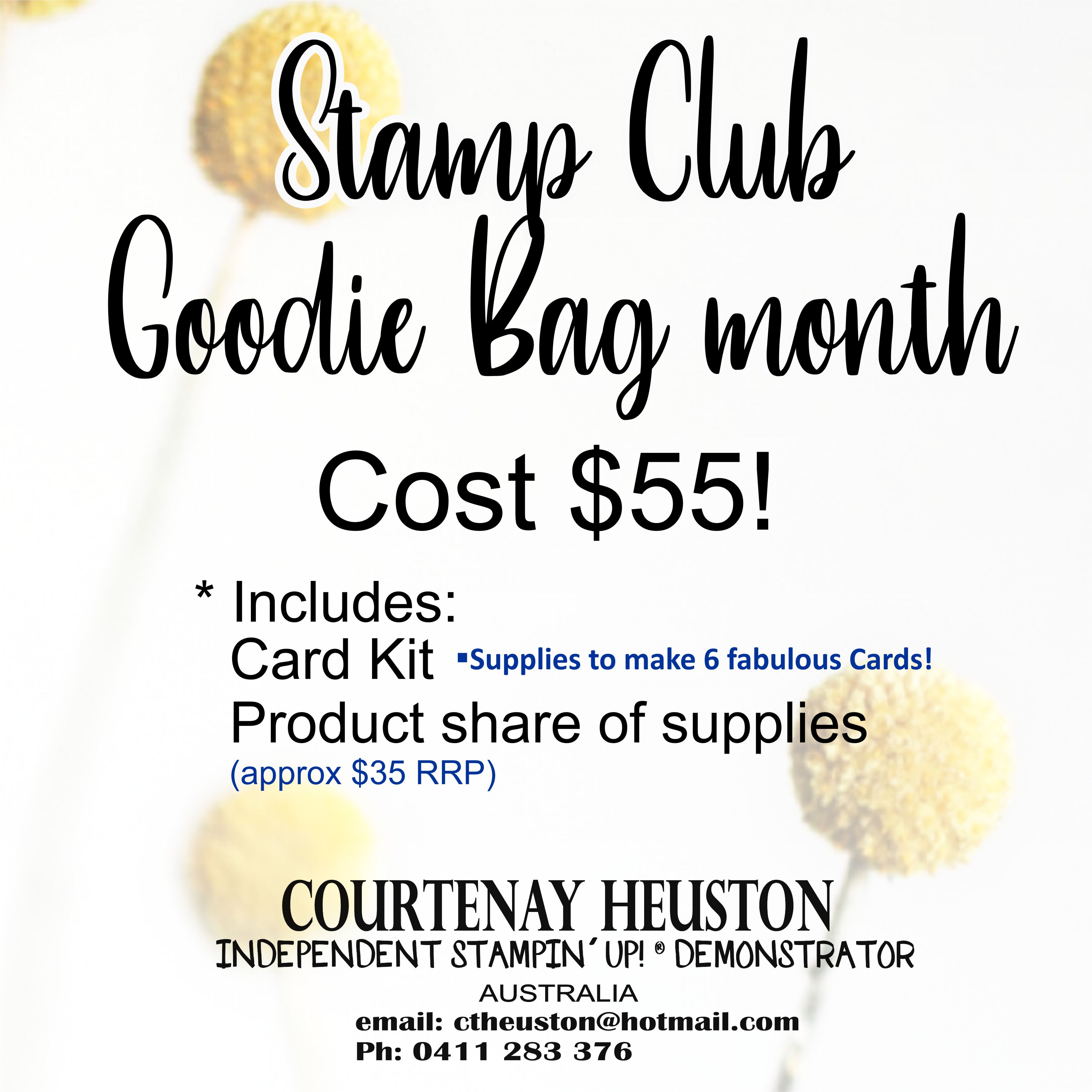 **Goodie bags are different each time and could include a share of embelishments, ribbons and or Designer Series paper depending on our projects.