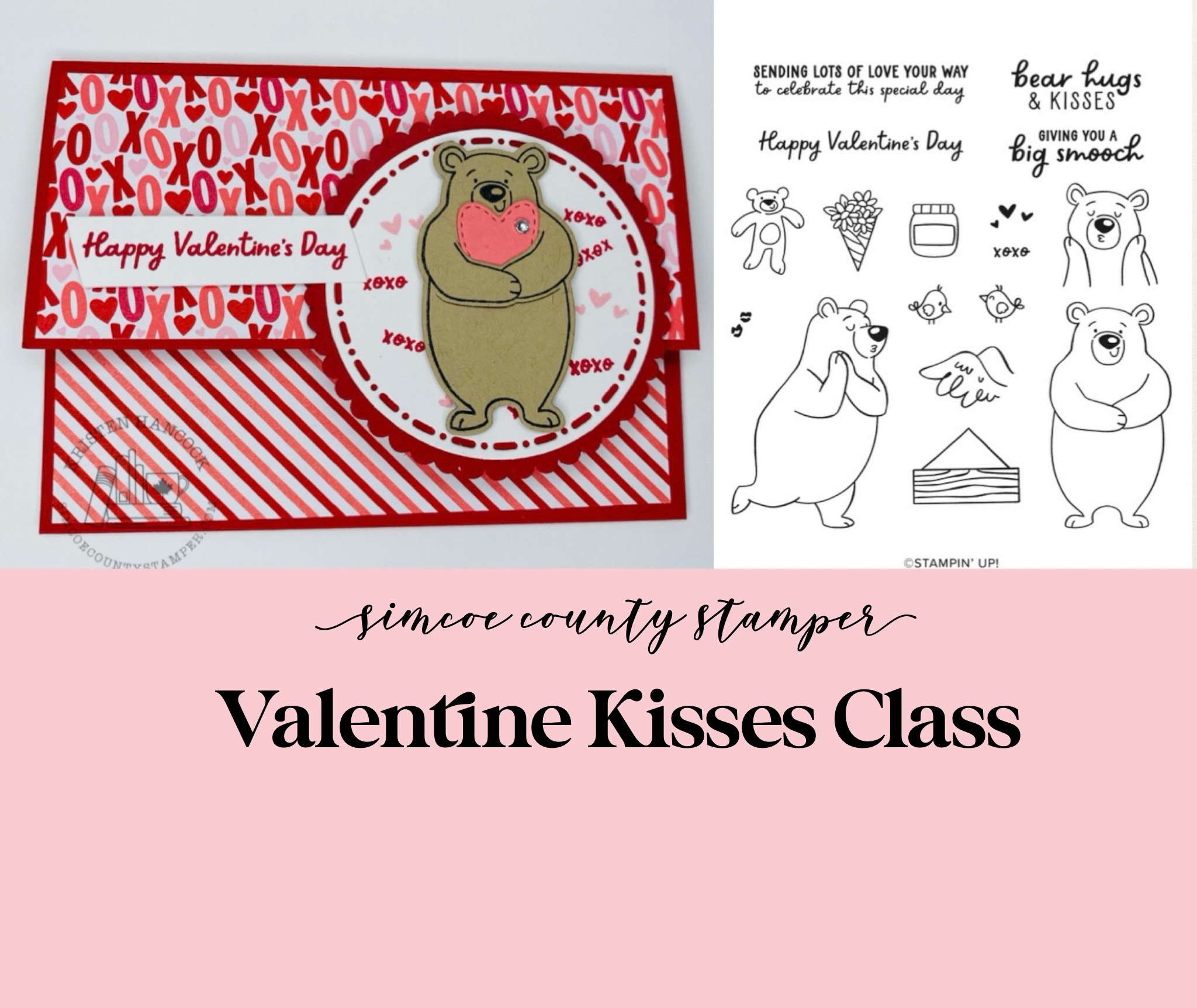 Class fee is $36.50 and is available for you to participate in person or online. If you participate online you will need to add $6.50 for shipping and will need a copy of the Valentine Kisses bundle to complete your projects. In Person attendees will be able to use mine to complete their projects.