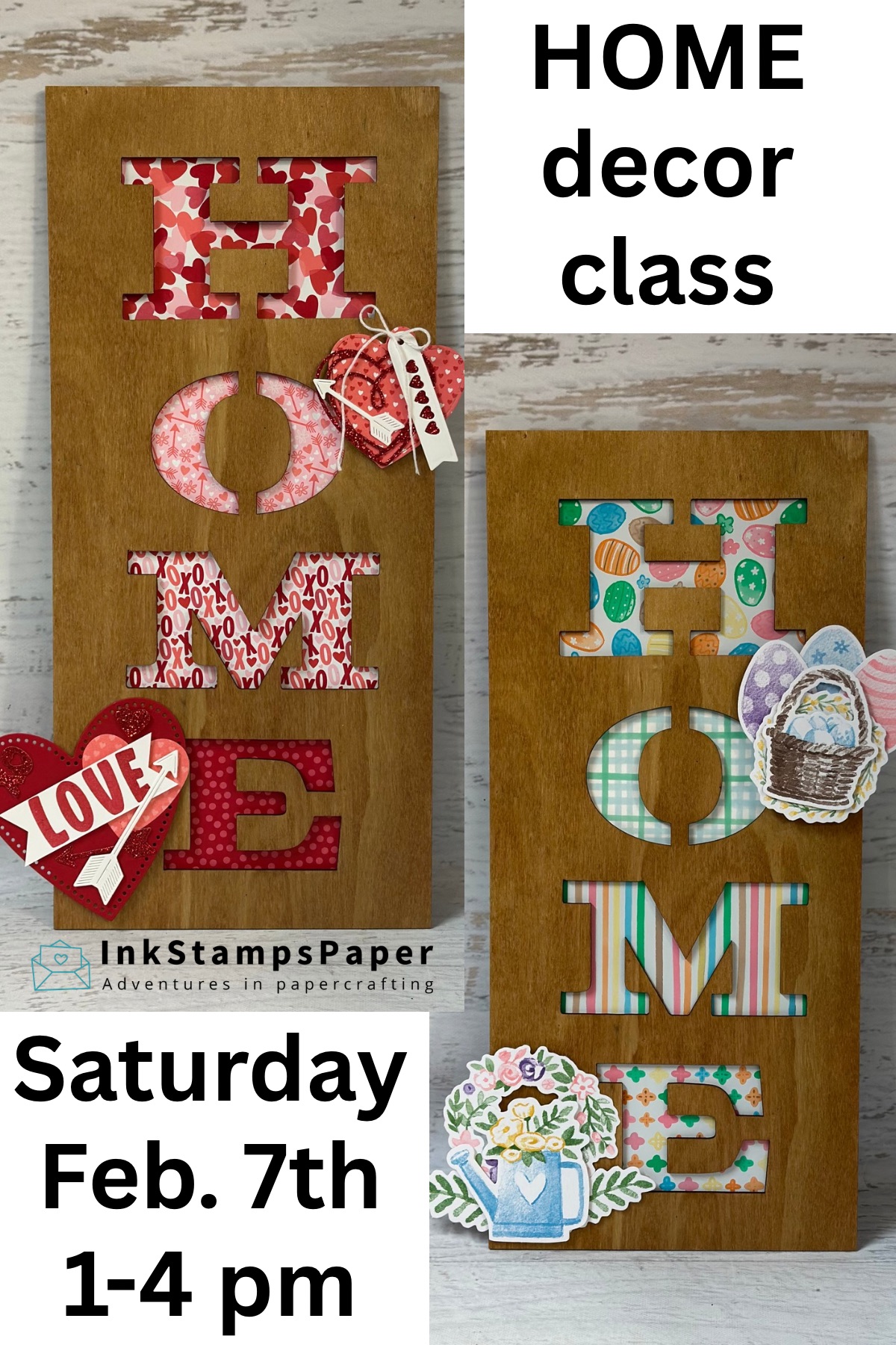 Join the fun and create a reversible wood “HOME” sign and 2 seasonal inserts (Valentines/love and Easter/Spring).