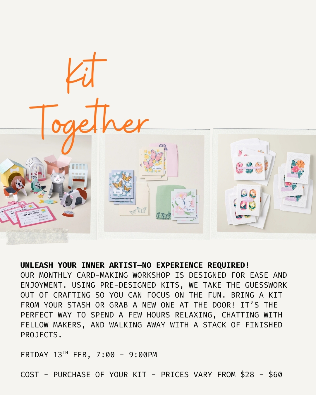 Bring along your Stampin' Up! kit to create in the company of others or purchase one from the selection I have.