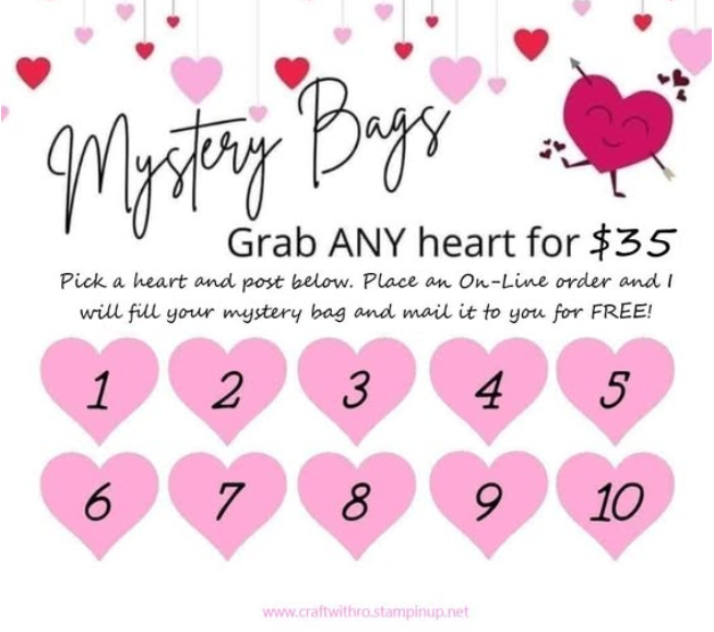 Exclusive Special!!!! Only 10 Mystery Bags available! Place a minimum $35 net order online and receive a FREE Mystery Bag! The more you spend the more goodies received. The Mystery bags will include retired and new product, some maybe gently used. It could include designer series paper, embellishments, stamp sets, card kits, pre-made cards and exclusive items!