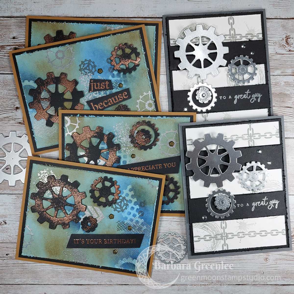 Make a 4-Pack of masculine grunge cards + 2 Bonus Spinner Cards for the men in your life featuring the Gears & Textures Bundle. We will heat emboss, stencil, & sponge our grunge backgrounds to make 4 cards with varying greetings. Includes envelopes, insides, door prizes, snacks, and fun! Price is a $25 Class Fee or a $35 min. order. Both options require an $8 supply fee (via Zelle 214-395-5586) at the time of your RSVP. All card stock and paper are pre-cut for you to just enjoy stamping & assembling your 6 cards.