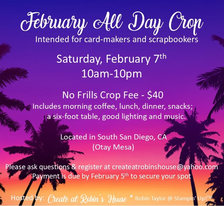 Bring your own project (or purchase one of my pre-cut kits) and have 12 hours of uninterrupted crafting time! I’ll take care of meals and snacks and you get to complete some projects. Find more info and all projects on my website: www.createatrobinshouse.com. Reserve your spot by February 5th at createatrobinshouse@yahoo.com. Happy crafting!