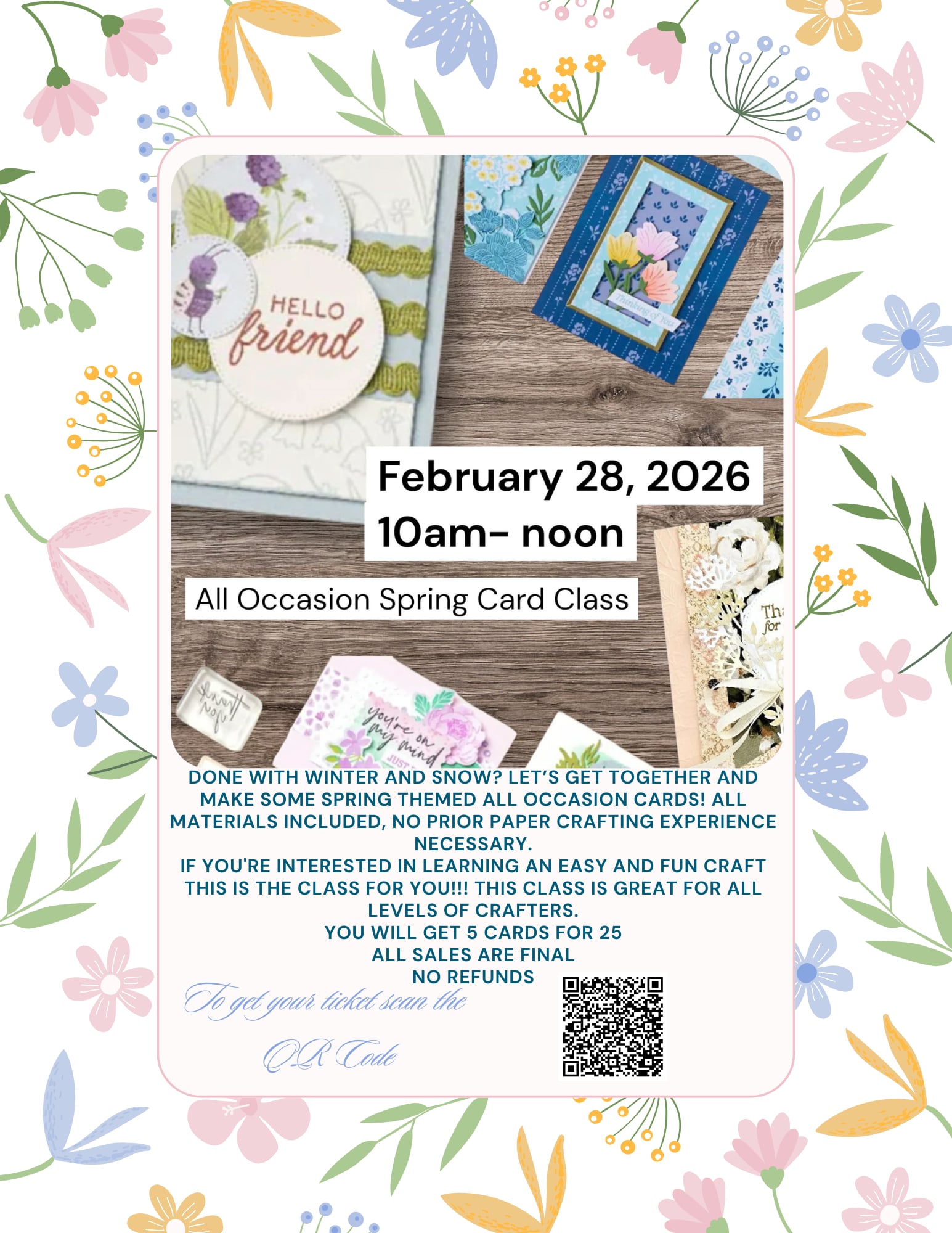 Join me for some beautiful spring cards . All supplies included. No previous experience necessary. Invite friends!