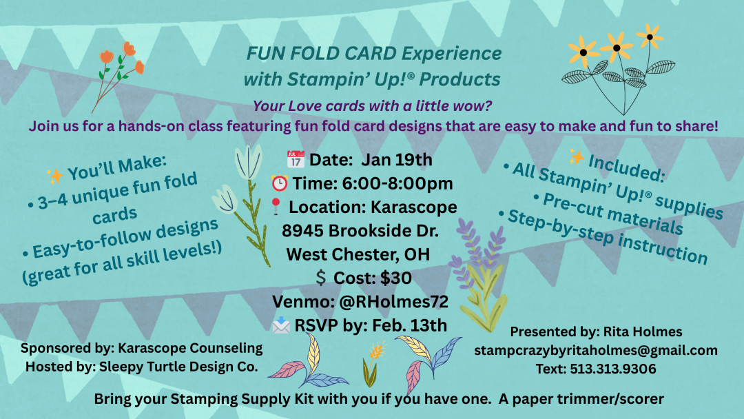 You will make 4 Fun Fold Cards that is easy to follow for all skill levels. This includes all pre-cut materials and step-by-step instructions. Please bring your class supply kit and a paper trimmer/scorer if you have one. What you mainly need is a scoring tool. Class fee is $30 which needs to be RSVP'd by Feb. 13th. You can VENMO me at @RHolmes72