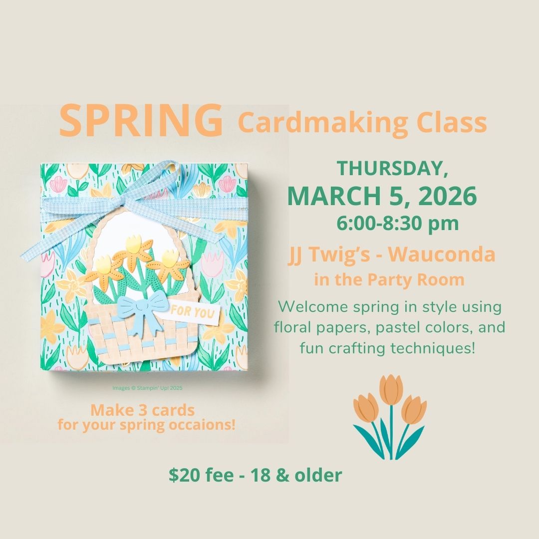Join us for our monthly craft night at JJ Twig's! You'll make THREE cards and a bonus treat pouch for a $20 fee. ALL supplies are included! This Spring class will use pretty floral paper, pastel colors for spring occasion cards. Learn how to make an easy pop-up card too!