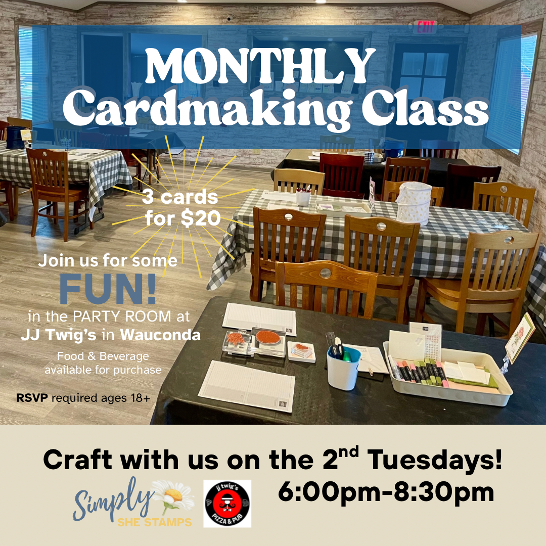 Join us for an evening of crafting with friends! Class fee is $20 and includes ALL supplies for three cards! Make a 4th bonus card/project when you bring a friend who hasn't attended our monthly card class before!