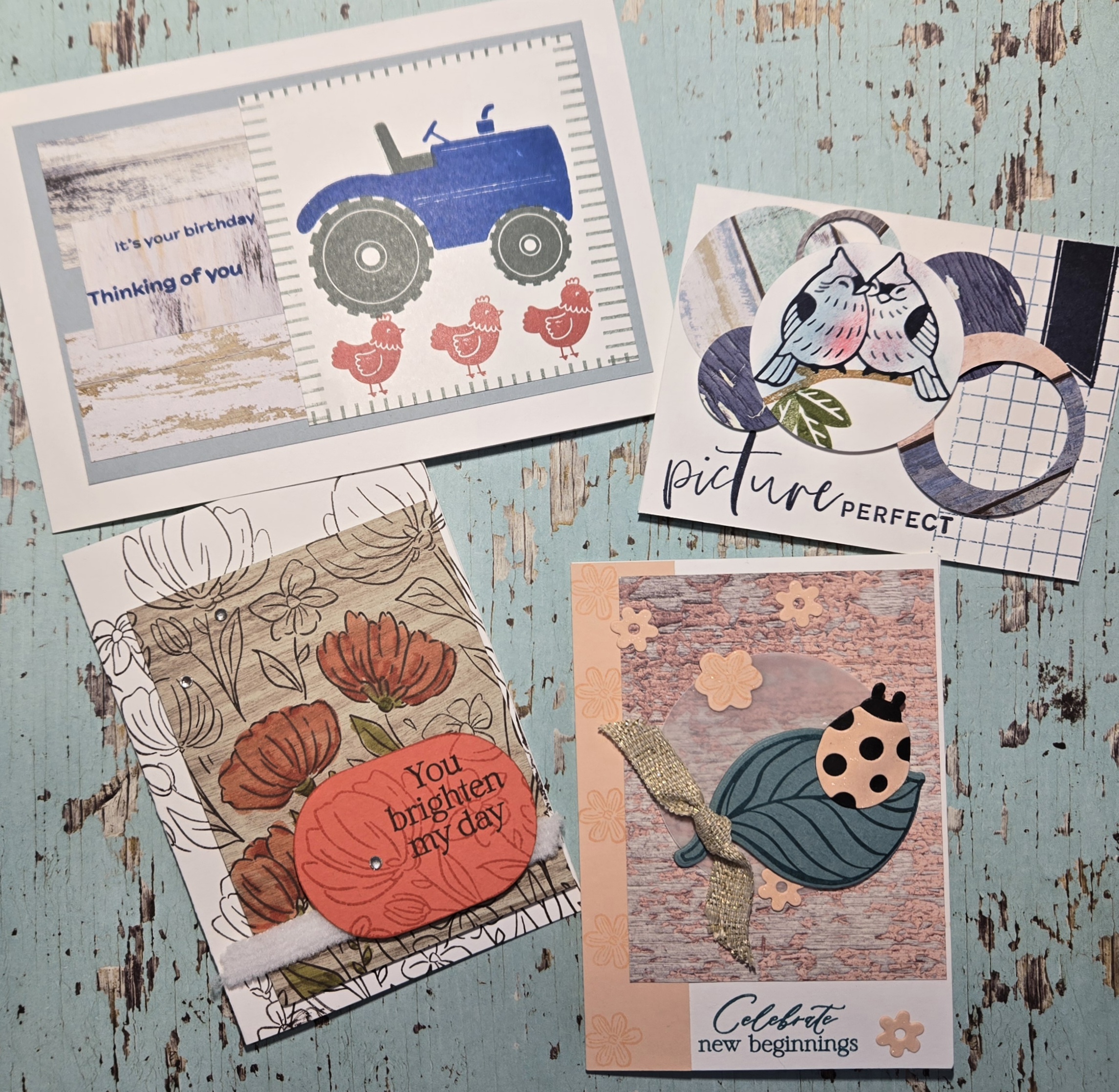 The idea is that you make one sample of each of the 4 designs and stamp and cut supplies for the remaining cards. Then you take those components home to assemble. The cards are designed to be versatile should come in handy for you to use for men, women and children, fo birthdays, congratulations and best wishes , among other events.