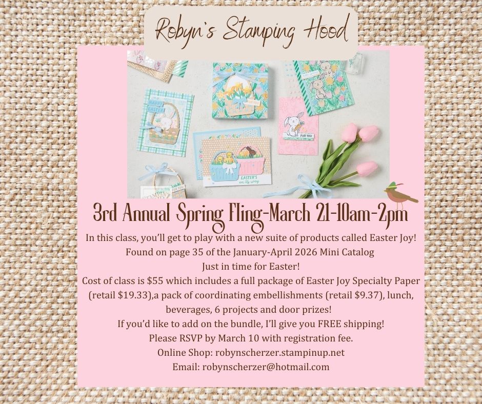 In this class, you’ll get to play with a new suite of products called Easter Joy! Found on page 35 of the January-April 2026 mini catalog. Cost of class includes: full package of Easter Joy Specialty Paper, coordinating embellishments, lunch, coffee/water, 6 projects & door prizes! Please RSVP by March 10th with registration fee.